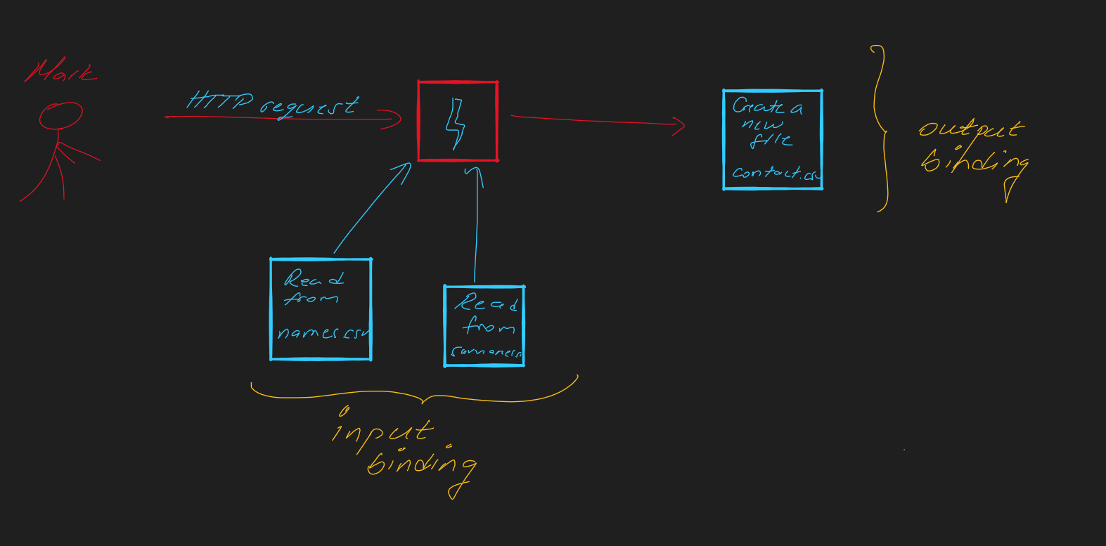 We have a function whose job is to read from two files: names.csv (containing the names of the employees) and surnames.csv (containing the surnames of the employees) and combine these two files into one employees.csv file. The function will be triggered by an HTTP request sent by Mark (the marketing manager)